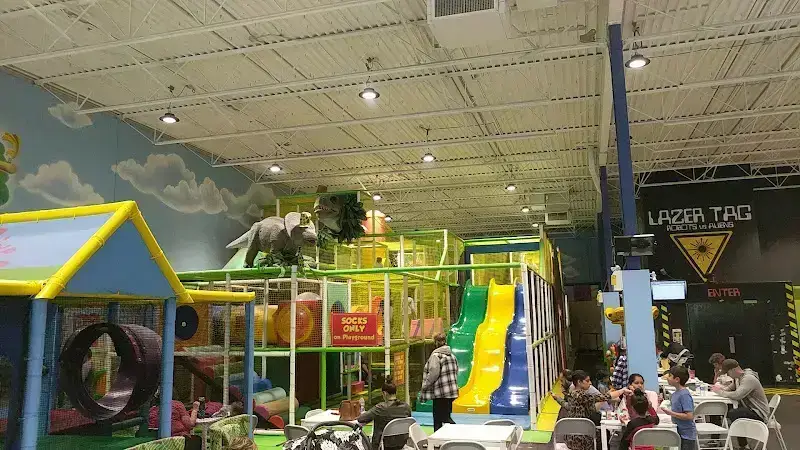 Multi-level Play Structure | Giant Tri-Coloured Slides | Tube Slides | Ball Pits | Rock Climbing Wall | Lazer Tag Arena | Toddler Playground | See-Thru Floors | Padded Obstacle Courses | Padded Tunnels | Private Party Rooms | Parents Lounge | Cafeteria | Shoe Cubbies | Change Tables