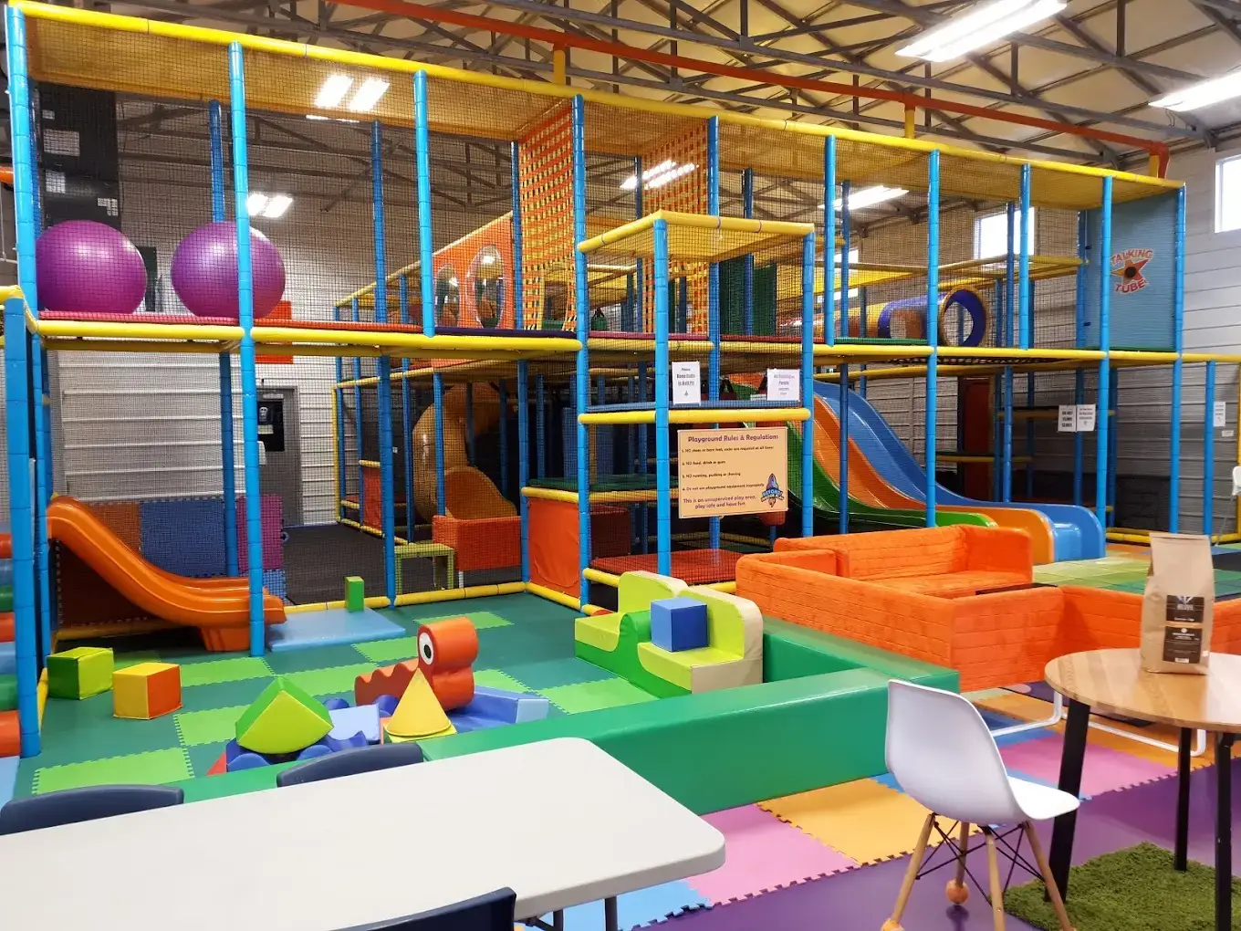 Multi-level Play Structure | Triple Wave Slides | Spiral Tube Slides | Padded Climbing Obstacles | Enclosed Crawl Tunnels | Dedicated Toddler Zone | Soft Play Foam Shapes | Interactive Activity Wall | Private Party Zone | Full Facility Rental Option | Parent Lounge Seating | Shoe Storage Cubbies | Secure Entry Gate | Change Tables