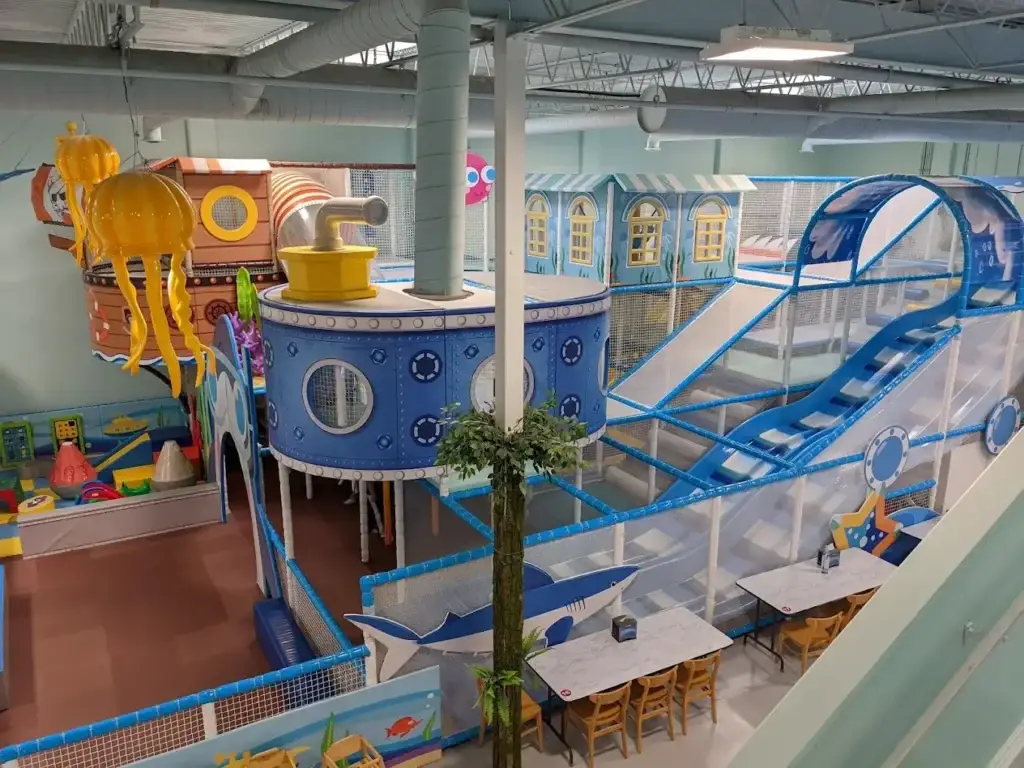 A 2,850 sq ft three-level soft play structure themed around the ocean, with climbing, sliding, and exploration zones designed to encourage active, imaginative play in a safe indoor environment.